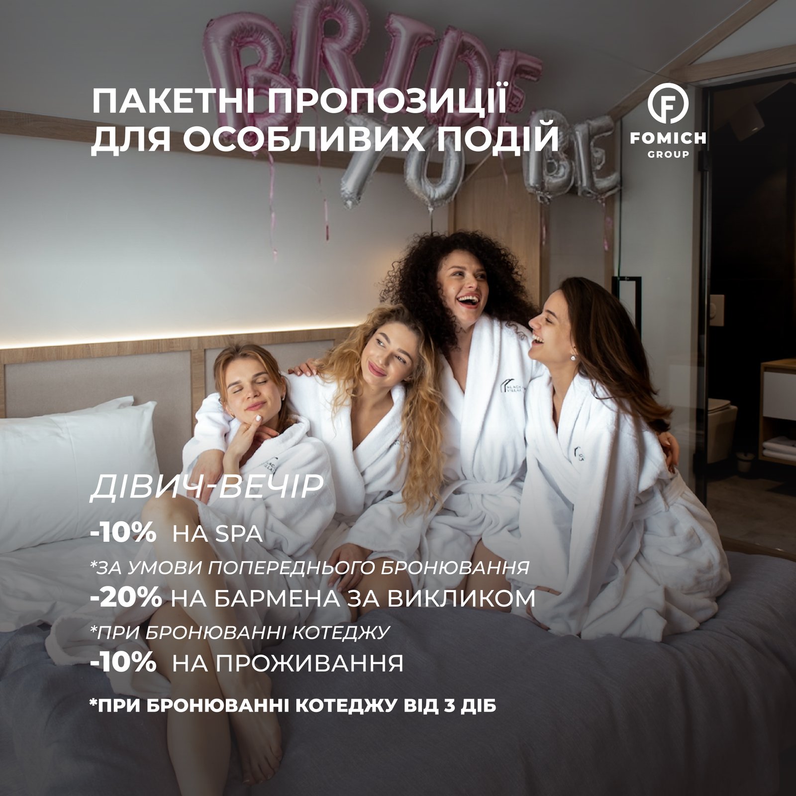 Уявіть ранок у халатах із чашкою кави, фотосесії з кульками Bride to Be, вечірні тости та атмосферу справжнього жіночого свята. Ми подбали про деталі, щоб ви могли насолоджуватися моментом.